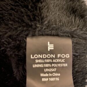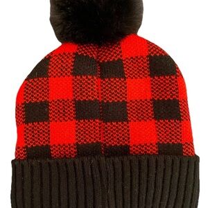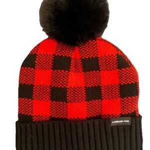 London Fog Women's Beanie Hat Red And Black Plaid Black Pom Pom Faux Fur Lining