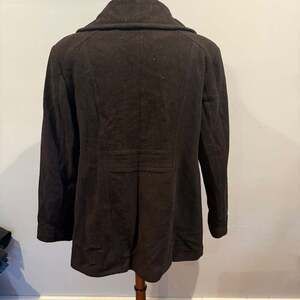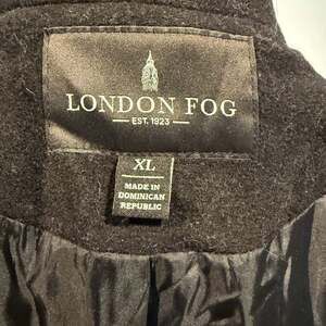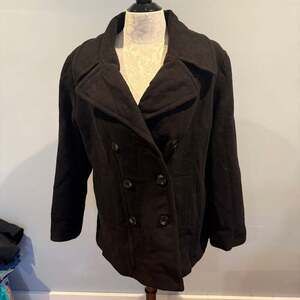 London Fog Women's Black Double Breasted Wool Blend Peacoat, size XL. This classic peacoat features a timeless design, perfect for cooler weather. Made with a wool blend for warmth and durability. Excellent pre-owned condition.