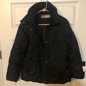 Womens Petite Down London Fog Winter Coat. Black. Perfect Condition. Only Flaw is that the piece to hang the jacket from came undone on one side, can be easily sewn back in place. (See Photo) Zipper with Added Button Closure. 2 Pockets on outside. 3 on Inside. Down Filled Collar. Drawstring Bottom. Sweater lined at Wrists.