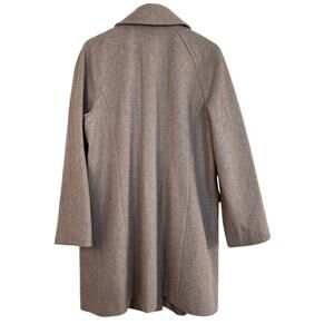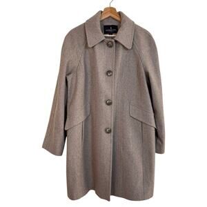 wool-blend fabric, single-breasted design, large button closure, mid-length cut, size large, notched lapel collar, two front pockets, fully lined interior, tailored fit, classic biege color