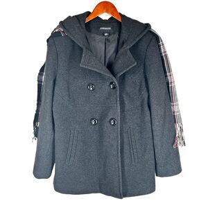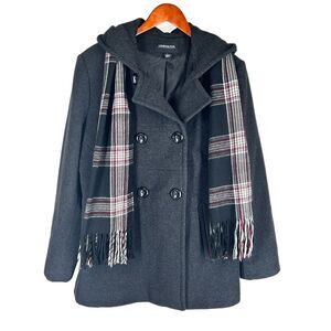 This cozy London Fog wool pea coat will keep you snuggly warm all fall and winter. It's dark gray with an attached plaid fringed scarf. The parka is double breasted for extra warmth, has long sleeves, deep front pockets, a hood and it's fully lined. Very gently preowned condition!