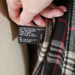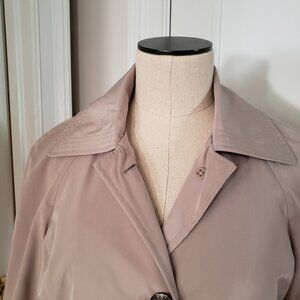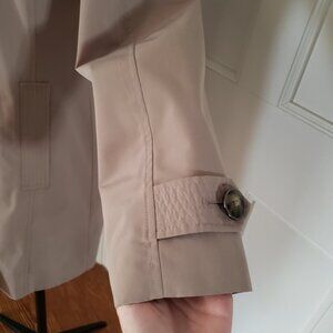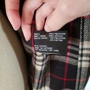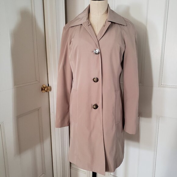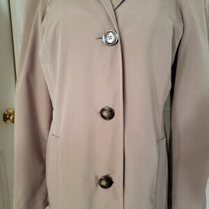 London Fog waterproof trench raincoat with cozy plaid lining and pockets, and buttons for detachable hood (NOT included! I got this pre-owned and it didn't have a hood). Coat is a sand color (see last photo for most accurate color).