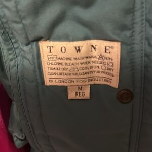 Towne by London fog, turquoise winter coat that features a full zip front, removable, fur trimmed hood, and removable lining. This is one of the warmest coats that I have ever had, and I love that it has the drawstring at the bottom and the removable inside. This is one of the warmest coats and transitions well from winter to spring then again from fall to winter. The inside puffy lining I believe is down, but I’m not 100% sure. I do know that it’s incredibly warm. This is a size medium and measures approximately 25 inches to pit on the outside so please leave a couple of inches for the thickness of the inside lining. Shoulder to bottom seam is about 29 inches. This is in good used condition. Still has lots of life left in it. Still looks great.