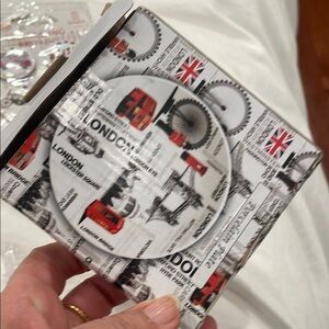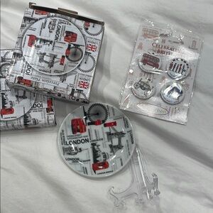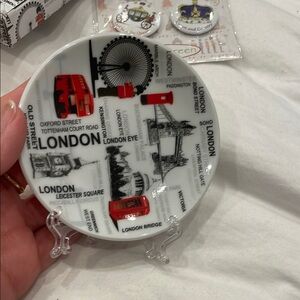 Two Brand new in the box, decorative small china plates with the stand.With collective set of 4 Button Badges. Coasters featuring London landmarks. Includes red buses and black text.