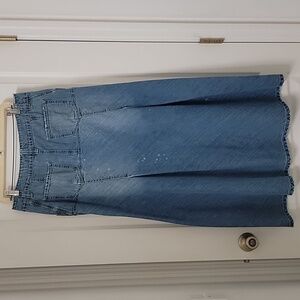 London Jean Size 10 Vintage Retro Maxi Distressed Denim Skirt, GUC. Gently Used Condition. No Holes, Rips, Stains or Snags. Factory Distressing, Fading, Whiskering and Bleach Spots. A-Line Style, Super Comfy and Very On-Trend! Please refer to measurements in photos to ensure proper fit.