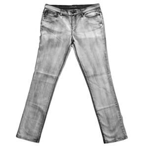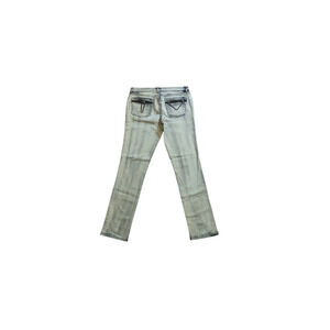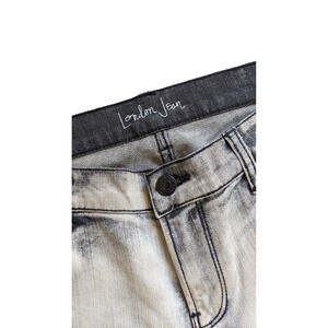 Unique jeans from London Jean feature a whitewash with black contrast stitching and back pockets that have zippers and chains. Size 12, great pre-owned condition.