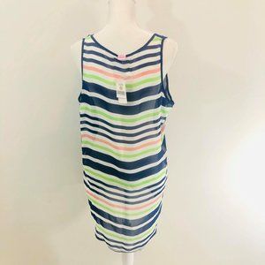 London Pie Woman’s Sz 1X Top Blue White Pink Green Horizontal Stripes Sheer Overlay NWT