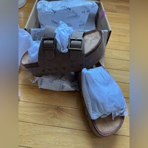 Chunky platform slide sandals with two adjustable buckles. Suede upper in warm brown