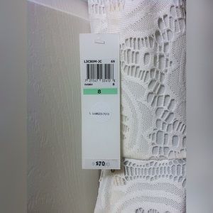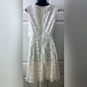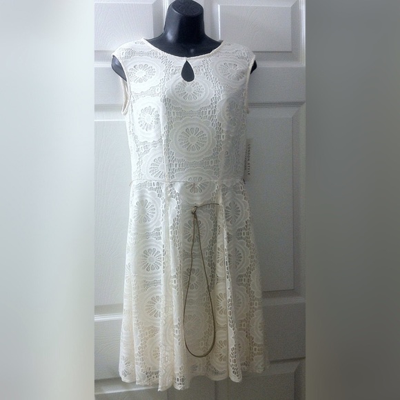 London Style Collection Ivory dress. This beautiful dress has a delicate crocheted pattern with a matching ivory under slip. It has a flattering fit and flare style, front keyhole, and back zipper. It comes complete with a metallic gold belt.