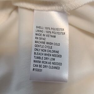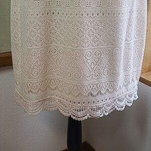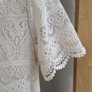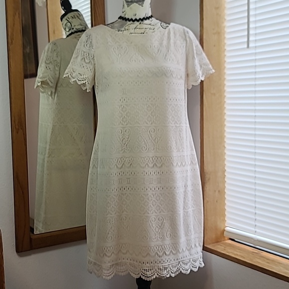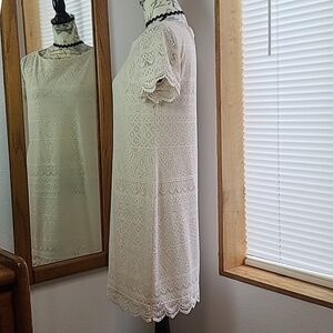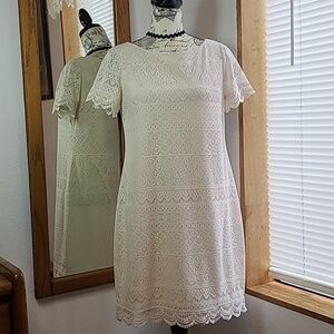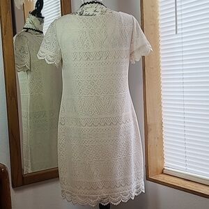 Cream lace with full cream lining. Sheer lace scalloped short sleeve.
