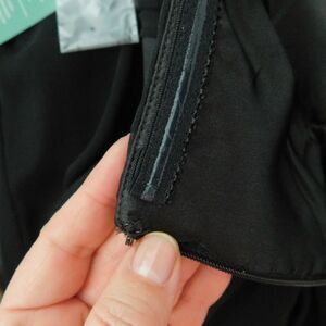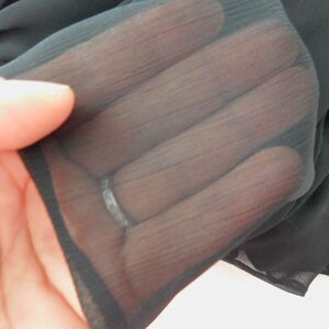 The Satin trim along the back is NOT gray. It couldn't get it to photograph correctly it is all solid black. The chiffon fabric is a more matte finish and the satin has a bit of sheen to it.