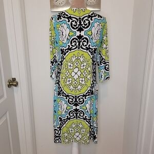 London Style, Size 8, Brightly Printed Floral Dress, EUC. Gorgeous Teal Blue and Bright Olive Green on Black and White will have eyes on you. 3/4 Length Sleeves. Pullover Style Sheath Dress. Great for Summer Parties! Please refer to measurements in photos to ensure proper fit.