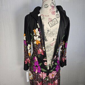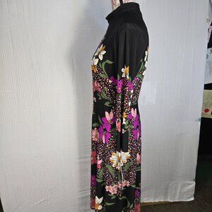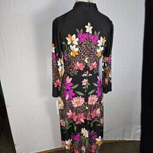 London Style Collection women's black and floral all over print dress. Has a mock neck and long sleeve with midi length making it a modest style dress. Zip up back. 95% polyester and 5% spandex give some stretch for comfort.