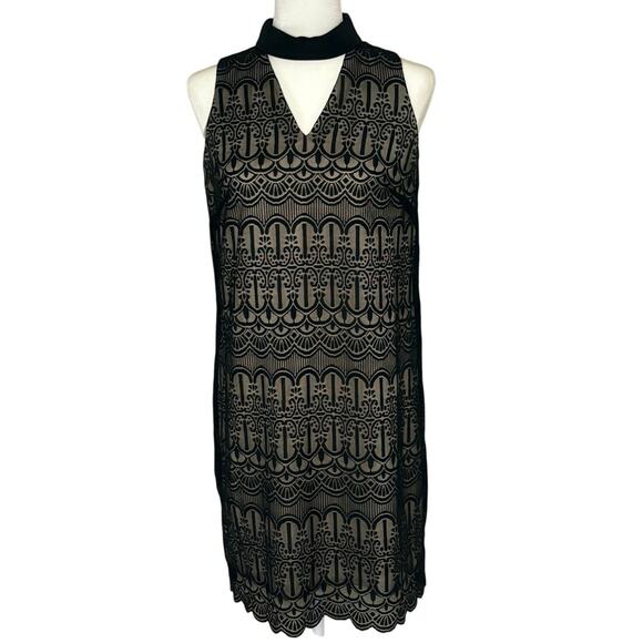 Channel your inner Gatsby with this vintage-inspired halter dress from London Times. With its elegant black lace overlay and nude lining, this piece brings timeless drama to any special occasion.