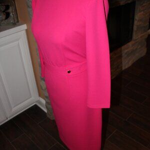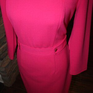 London Times, pink, round neck, 3/4 sleeve sheath dress. Waist buckle accent with gold buttons. Hidden back zip closure. 96% Polyester, 4% Spandex. Top bodice of dress is lined. Machine Cold Wash. Dress has only been dry cleaned. 39 inches shoulder to hem.