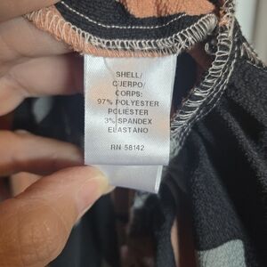 Stylish dress with an abstract floral print. Features a mix of black, orange, and cream colors.