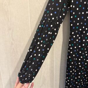 Elegant long sleeve dress by London Times. Features a black base with blue and white polka dots. Perfect for any occasion.