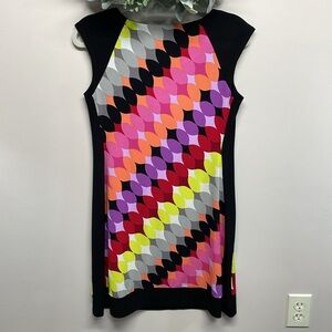 London Times Black Multicolor Sleeveless Dress in size 8. Excellent preowned condition. Pullover style, rounded neckline with pleated detail, lightweight polyester and spandex blend. Please see photos for approximate measurements and details. Item may show difference in color based upon photography and perception. Photos are part of the description, as everyone’s level of condition may vary. From smoke free and pet free home. All packages are shipped the same or next business day.