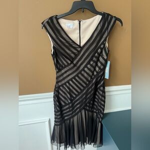 This striking dress by London Times features a sophisticated black and nude color palette with an asymmetrical, ruffled, and tiered design. The sleeveless sheath silhouette is complemented by a V-neckline, making it perfect for cocktail parties or a night out. The unique pattern and fluid bottom section add a modern touch to this elegant piece.