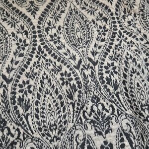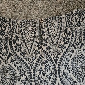 Stylish dress with intricate black and cream pattern. Features three-quarter sleeves and a flattering silhouette.