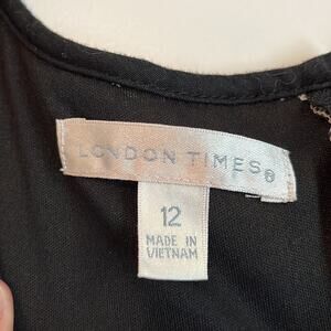 London Times Black with Lace Sleeveless Sheath Dress, size 12. Solid black skirt, white lace bodice with black lining underneath. Sleeveless, sheath style with wide waistband, back zip, stretchy fabric.