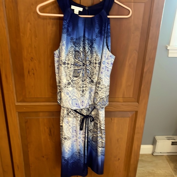This is a blue overall pattern dress with less than 1/2 “ navy belt, 2 fabric belt loops on either side. Lined dress is 95% polyester 5% rayon & lining is 100% polyester