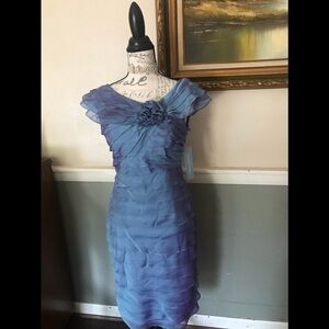 Gorgeous London Times Blue Magic Cap sleeves tiered Sheath rosette dress.Tiered Sheen fabric.New with Original tags 134.00.Wear this beauty to any special occasion. Hard to find a dress. Look gorgeous, elegant, and classy!!