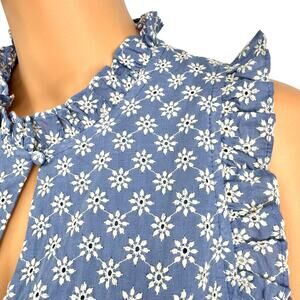 chambray dress, embroidered dress, sleeveless summer dress, London Times dress, floral eyelet, blue cotton dress, ruffle trim dress, picnic dress, cottagecore style, classic cotton dress