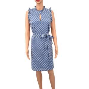 London Times Chambray Ruffle Eyelet Belted Cotton Dress Womens Size 8 NWT
