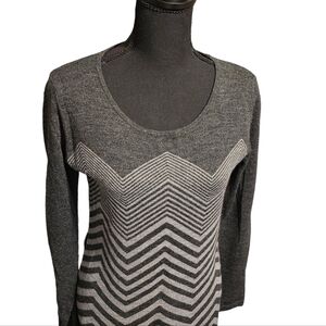 2 tone grey and dark grey, long sleeve, chevron pattern on front, scoop neck, knee length, sweater dress. Size M