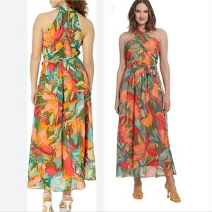 Bold floral maxi dress with halter neckline. Ideal for vibrant summer style.