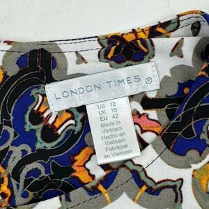 Get ready to turn heads with this beautiful multicolored A-line shift dress from London Times! Perfect for any occasion, whether it's a wedding, party, or a casual day out. Designed with a round neckline and short sleeves, this dress is made of a comfortable cotton blend with a hint of spandex for added stretch. The dress length is short, making it perfect for warmer seasons, but can easily be paired with tights or leggings for cooler weather. The dress features an abstract kaleidoscope pattern that is sure to catch everyone's eye. It can be easily cared for as it is machine washable. The dress is available in a size 12, making it perfect for regular-sized women. With its colorful design, stretchy material, and versatile style, this dress is a must-have for any fashion-forward woman's wardrobe.