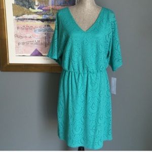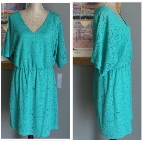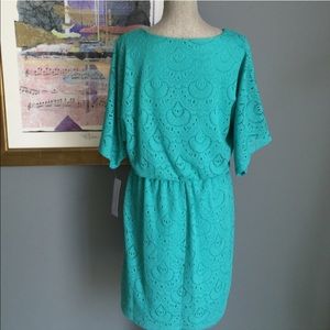Lovely dress from London Times. Color is mint green (showing up more bluish in photos). Elastic waistband, fully lined, made of 100% polyester. Perfect for work or an evening out!