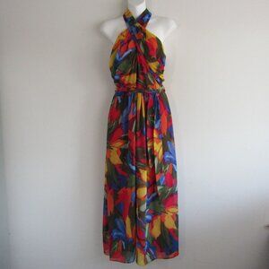London Times Dress 6 Petite Colorful Floral Maxi Criss Cross Halter Maximalist
