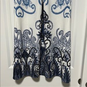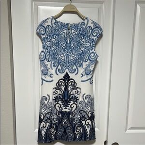 This chic dress by London Times showcases a captivating blue and white pattern, perfect for wedding guests or cocktail events. Featuring a crew neck and cap sleeves, this mini dress offers a stylish and comfortable fit.