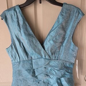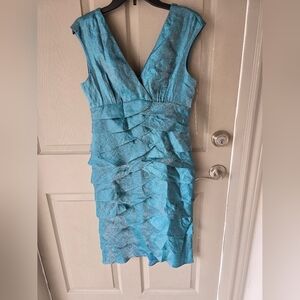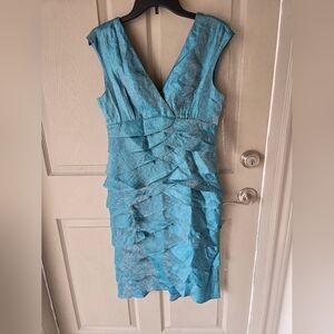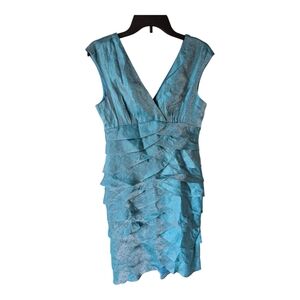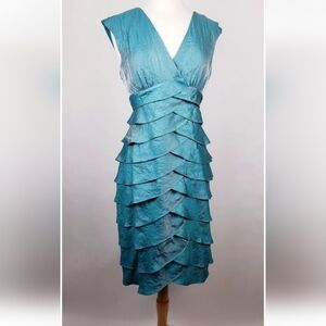 London Times Dress Pencil Womens Size 8 Teal Green V-Neck Tiered Overlay New