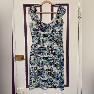 Beautiful and flattering London Times sleeveless dress featuring a vibrant floral print in shades of blue, green, purple, and white. This dress has a draped V-neckline with a ruched, pleated bodice that enhances the silhouette. The back zipper closure ensures a perfect fit. Ideal for weddings, cocktail parties, or special occasions.