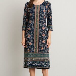 Beautiful and comfortable London Times floral sheath dress in a boho-inspired mixed print design. Features a flattering straight silhouette with 3/4 sleeves and a scoop neckline. Crafted from soft stretch fabric for an easy, curve-hugging fit. Perfect for work, church, or brunch occasions.