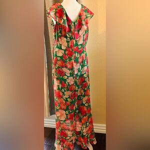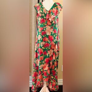 London Times Green and Pink Ruffled Floral Maxi Dress