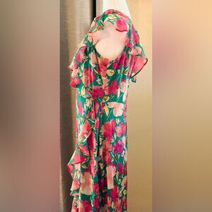 London Times Green and Pink Ruffled Floral Maxi Dress