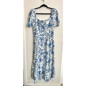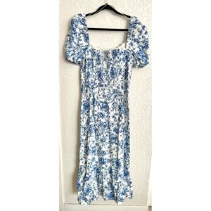 Feminine floral printed rayon/linen fabric, square front and back necks, short puff sleeves with elastic at shoulders and hems, shirred empire waisted bodice, smocking at back bodice, waist and princess seams, and a midi length skirt with a side front slit detail. This dress is bodice lined in 100% Polyester and has a left side seam zipper closure. This dress does not have pockets.