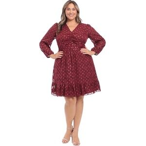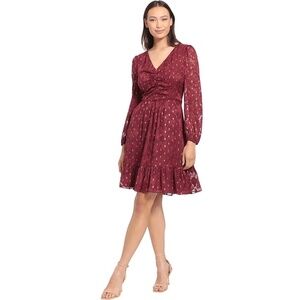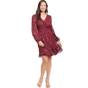London Times: Long Sleeve Burgundy Chiffon & Gold Dot Dress (NWT)