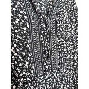 This maxi dress offers a flattering silhouette with its relaxed fit. It features a floral pattern and detailed accents on the front and sleeves.