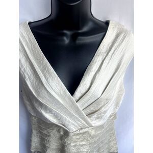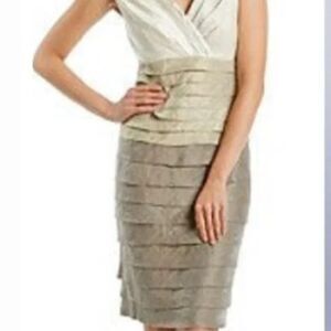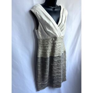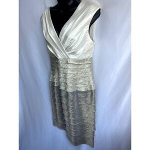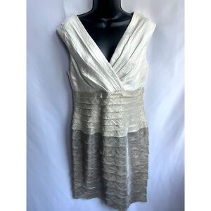 London Times Metallic Bodycon Beige Bandage Dress Size 10 Classy Tiered V Neck