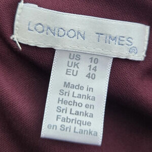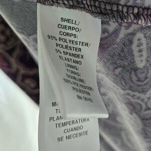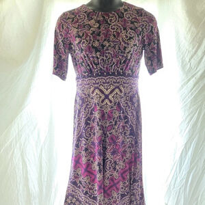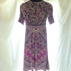 Purple paisley midi length dress with figure flattering design and 3/4 sleeves.