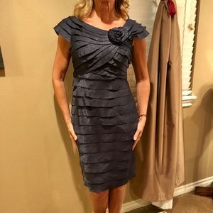 Incredibly flattering and comfortable formal dress, with a subtle sheen to this steel blue fabric.