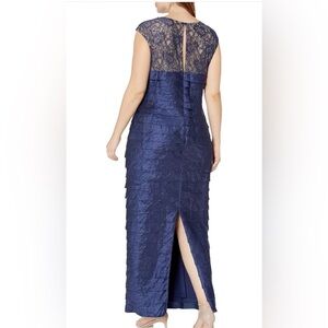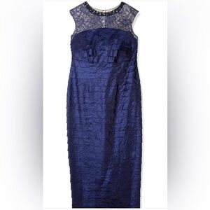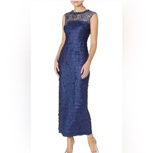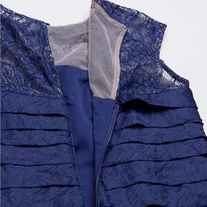 London Times Pleated Evening Gown Lace Yoke Beaded Jeweled Neck Navy Blue