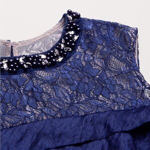 London Times Pleated Evening Gown Lace Yoke Beaded Jeweled Neck Navy Blue 14