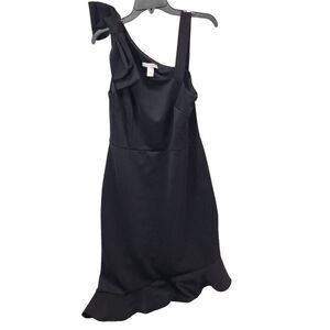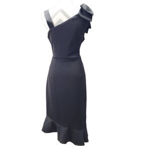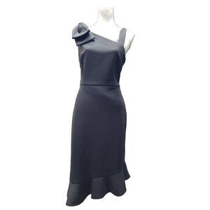 London Times Size 12 Black One-Shoulder Ruffle Midi Fit and Flare Bow Wedding Guest