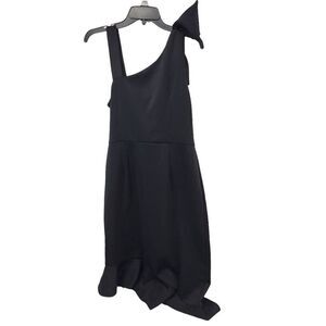 London Times Size 12 Black One-Shoulder Ruffle Midi Fit and Flare Bow Wedding Gu